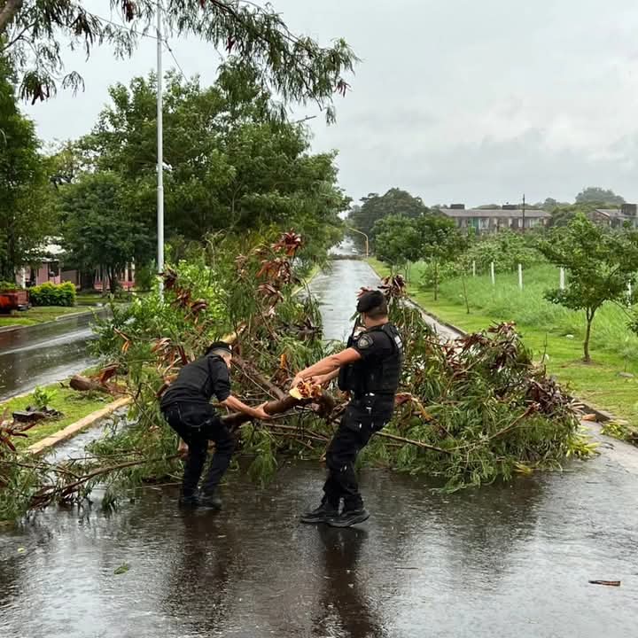 Por ello, la fuerza provincial intervino en tareas de asistencia a familias afectadas, evacuaciones preventivas, despeje de calles y prevención de riesgos, trabajando articuladamente con Defensa Civil, Energía de Misiones y autoridades municipales.