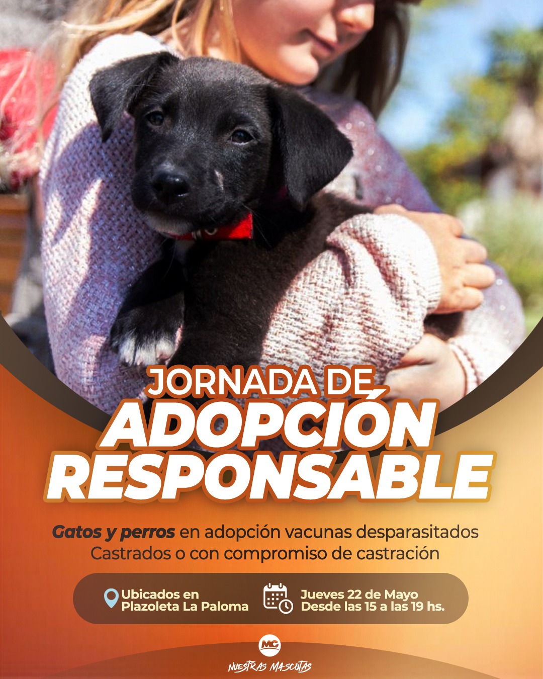 La actividad será el jueves 22 de mayo, de 15:00h a 19:00h en La Paloma. Allí, las personas y familias que deseen adoptar un animal, tendrán la oportunidad de conocer a perros y gatos que necesitan una oportunidad.