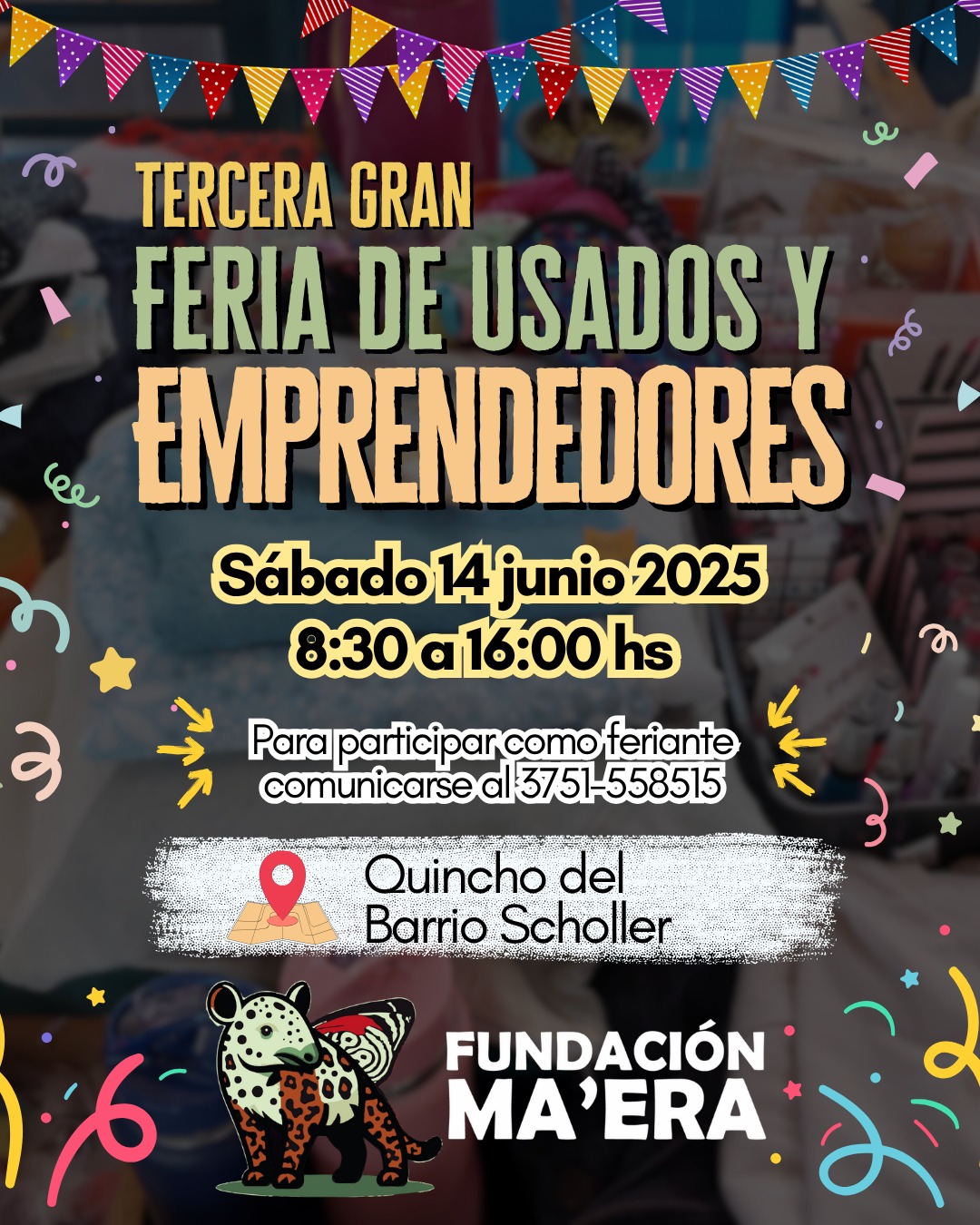 Desde la fundación MA'ERA, con sede en la ciudad de Eldorado, cuyos ejes de trabajo son Ambiente y sostenibilidad; Diversidad biocultural y educación intercultural; Arte, cultura y patrimonio; Desarrollo social, salud y bienestar comunitario; Información, comunicación y divulgacion; hacen extensiva la invitación a la comunidad para participar en la Tercera Gran Feria del Usado y de Emprendedores a llevarse a cabo este sábado 14 de junio, en el quincho de Barrio Scholler, a partir de las 8 de la mañana y hasta las 16 hs.