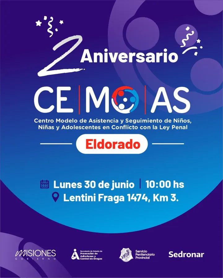 Este lunes 30 de junio a las 10:00 hs, se realizará la ceremonia por el 2º aniversario del Centro Modelo de Asistencia y Seguimiento de Niños, Niñas y Adolescentes en conflicto con la Ley Penal (Ce.Mo.A.S) en la ciudad de Eldorado.