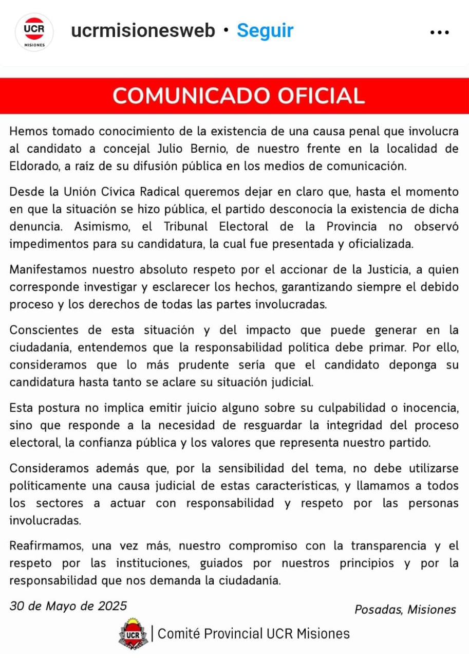 El Comité Central de la Unión Cívica Radical (UCR) emitió el viernes al mediodía un comunicado en el considera “prudente” que el candidato a concejal de Eldorado Julio César Bernio “deponga” de su postulación tras conocerse que en su contra pesa una denuncia por abuso sexual.