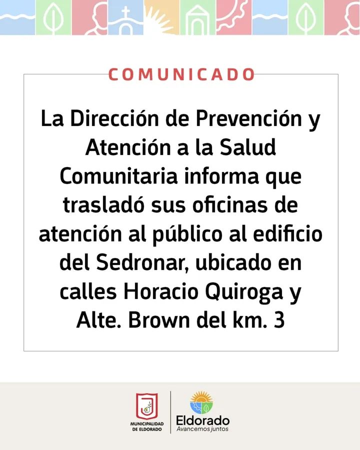 La Dirección de Prevención y Atención a la Salud Comunitaria informa que trasladó sus oficinas de atención al público al edificio del Sedronar, ubicado sobre calle Horacio Quiroga y Alte.Brown en el kilómetro 3.