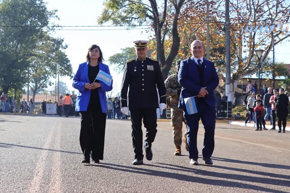 Fuerzas de seguridad e instituciones civiles marcharon con orgullo este mièrcoles sobre la avenida San Martín, a la altura del km 2, mientras familias de toda la ciudad acompañaron y disfrutaron de una jornada fresca y soleada, llena de emoción y espíritu patrio.