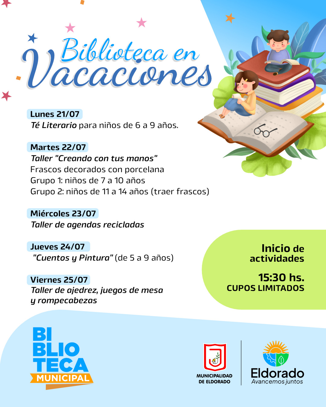 La Biblioteca Municipal de Eldorado prepara una semana especial para estas vacaciones de invierno, con actividades destinadas a niños y niñas de la ciudad. Desde el lunes 21 hasta el viernes 25 de julio, se realizarán talleres, juegos y espacios de lectura que invitan a compartir en familia y despertar la imaginación.