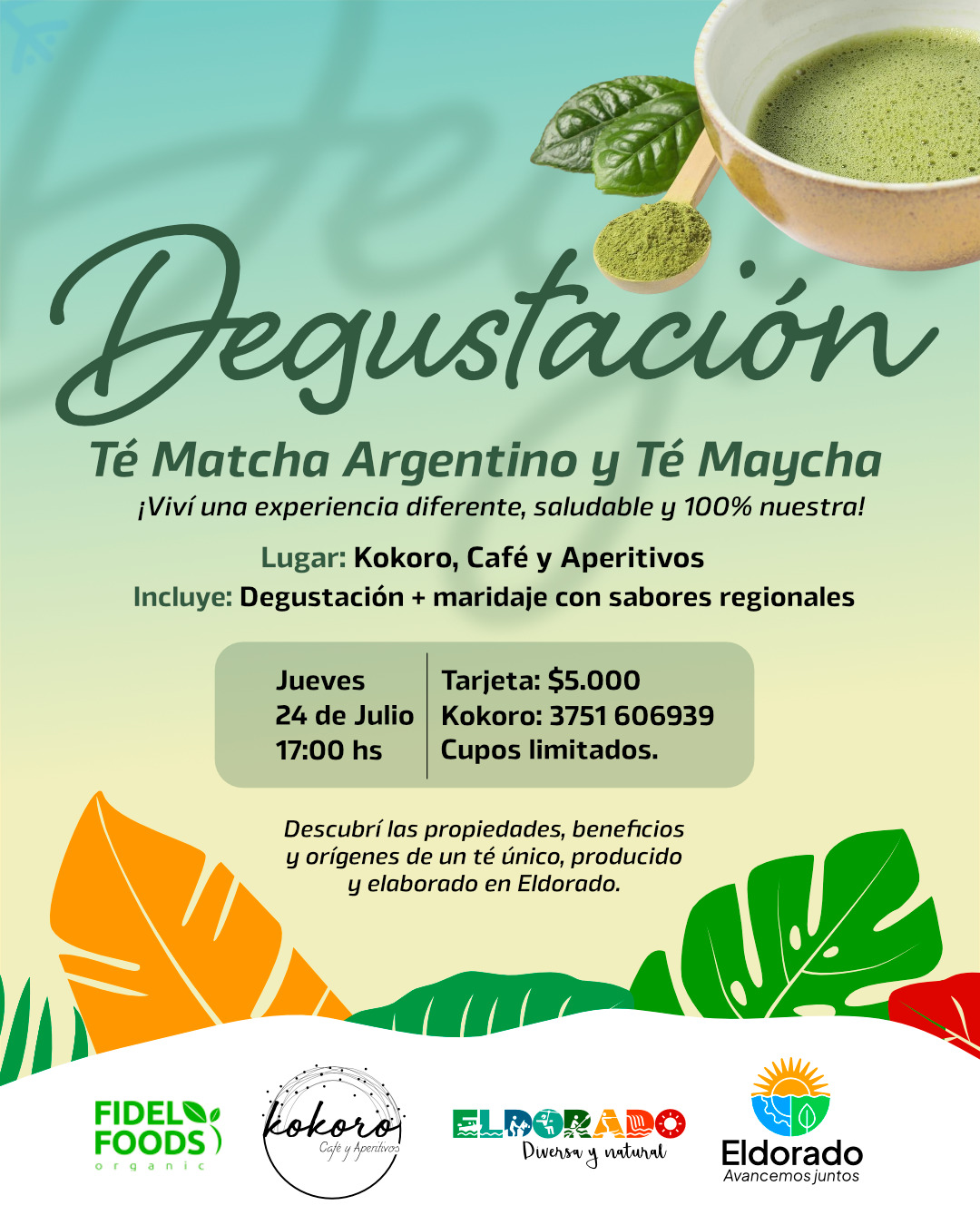Este jueves 24 de julio a las 17:00, Kokoro Café y Aperitivos abre sus puertas a una propuesta especial: una degustación de Té Matcha Argentino y Té Maycha, dos variedades elaboradas íntegramente en Eldorado.