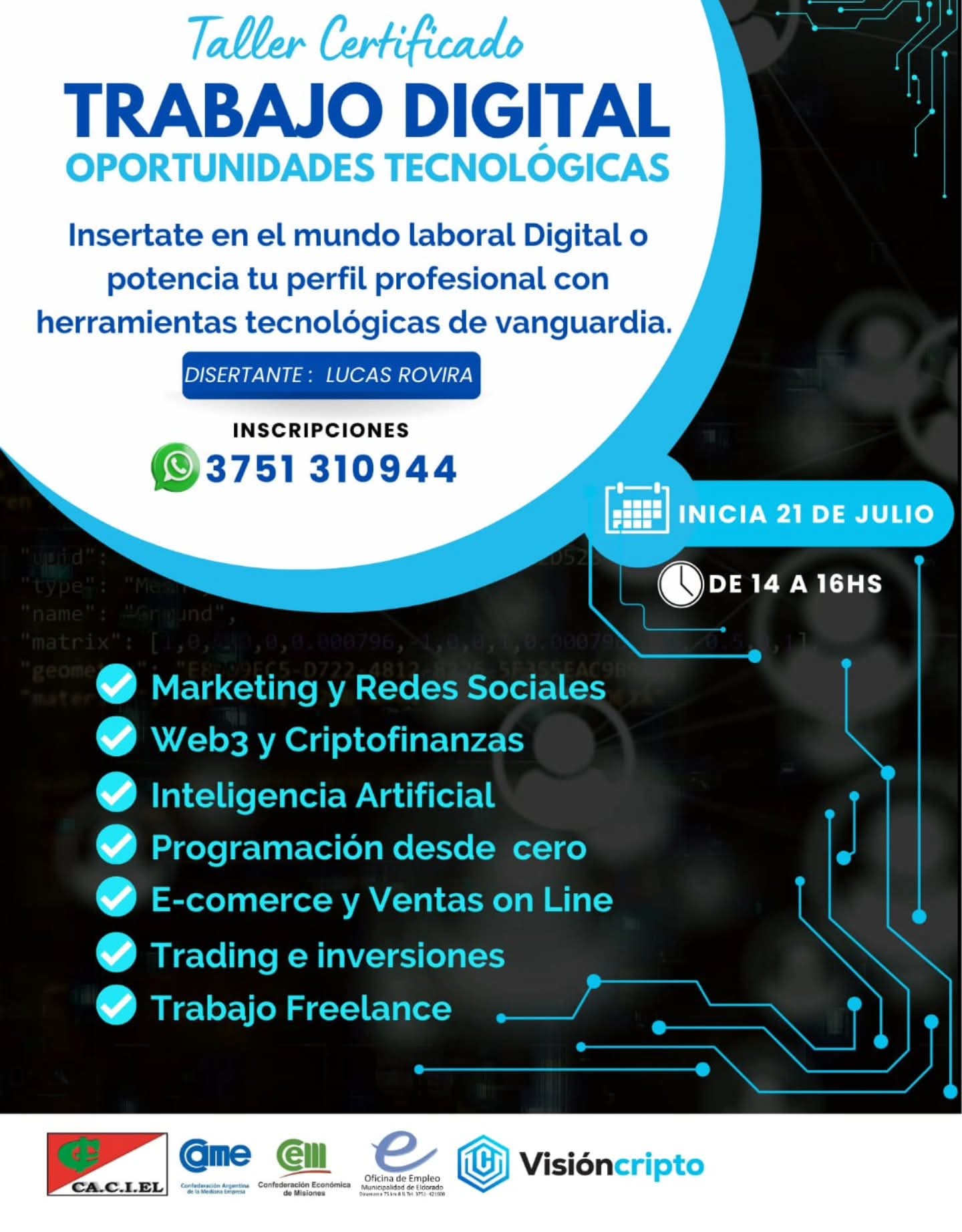 La Municipalidad de Eldorado invita a jóvenes y adultos a participar del taller “Trabajo Digital – Oportunidades Tecnológicas”, una propuesta innovadora pensada para quienes desean insertarse en el mundo laboral digital o potenciar su perfil profesional con herramientas de vanguardia. El curso brinda conocimientos claves sobre áreas en expansión como marketing y redes sociales, programación desde cero, inteligencia artificial, e-commerce, trading, criptofinanzas, Web3 y trabajo freelance.