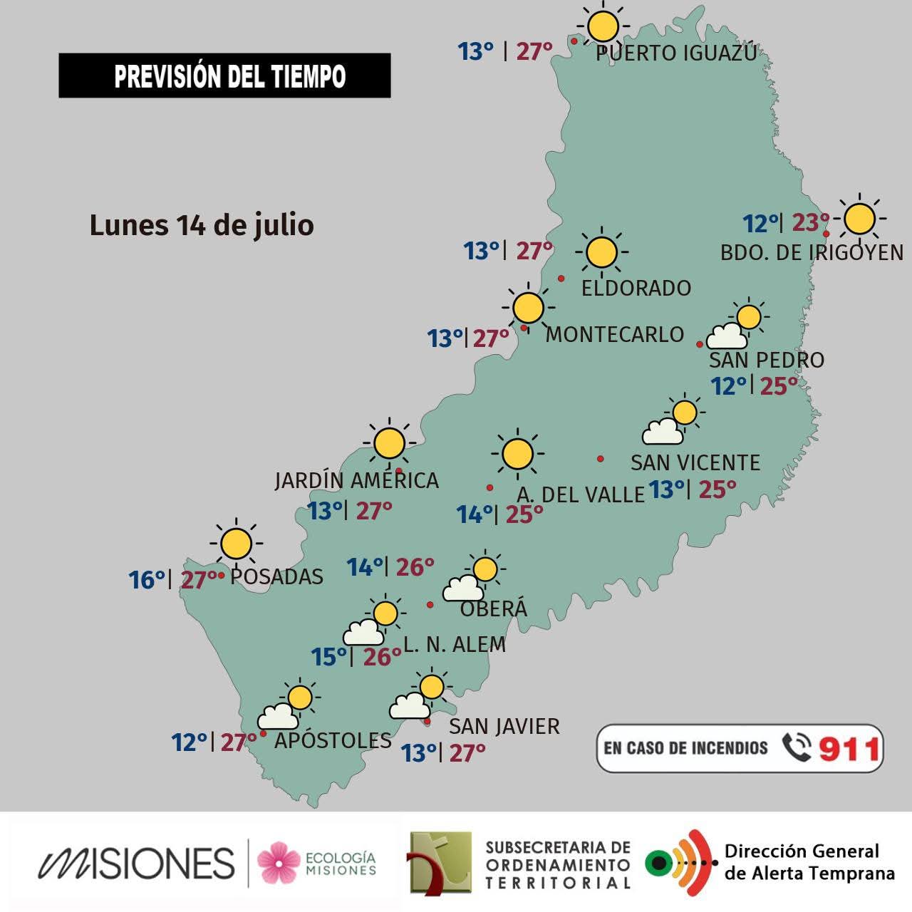 Temperaturas: máxima en la provincia estimada en 27 °C para Posadas la mínima sería de 12 °C en San Pedro.