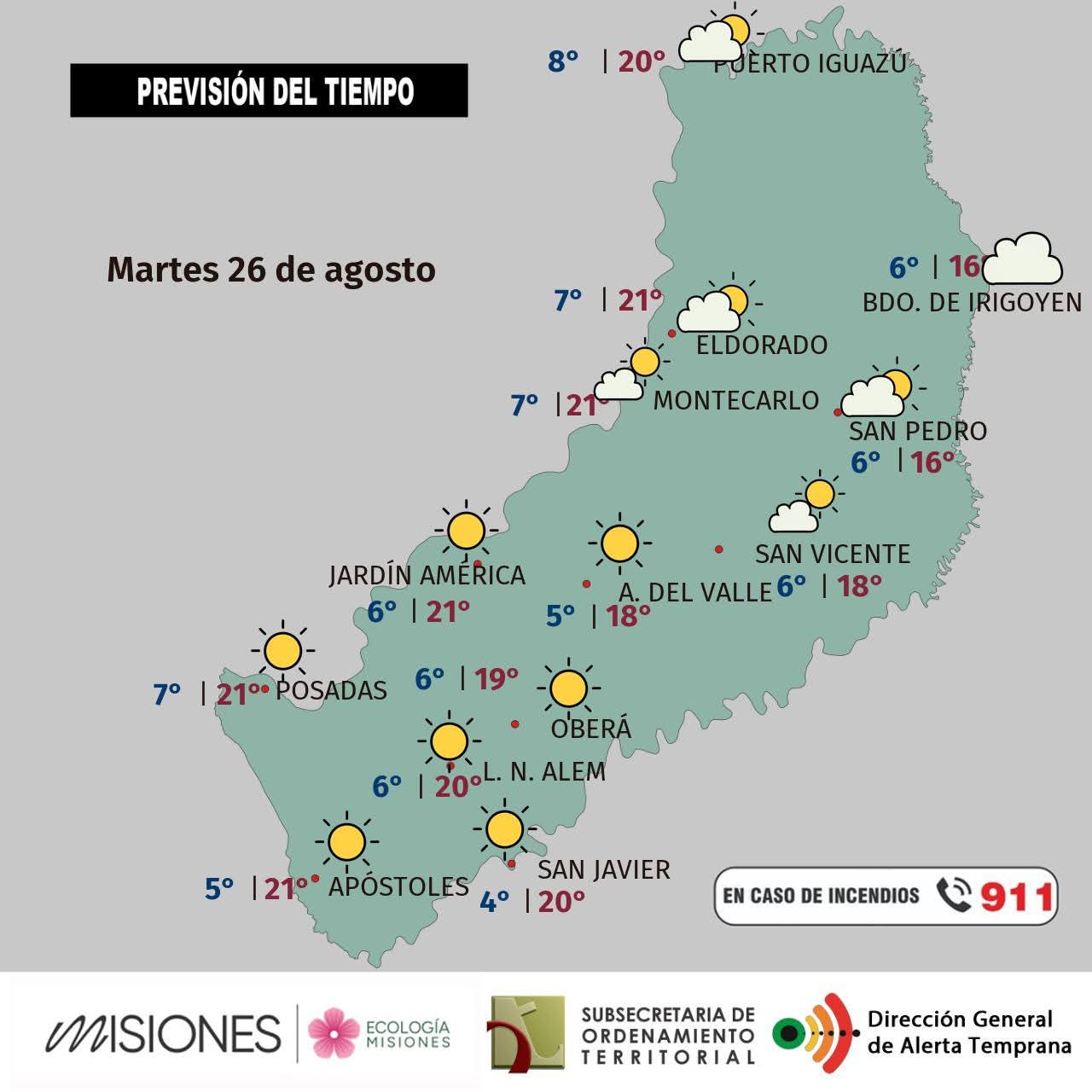 Temperaturas: máxima en la provincia estimada en 25 °C para Puerto Iguazú, la mínima sería de 9 °C en Apóstoles con 8 °C de sensación térmica.