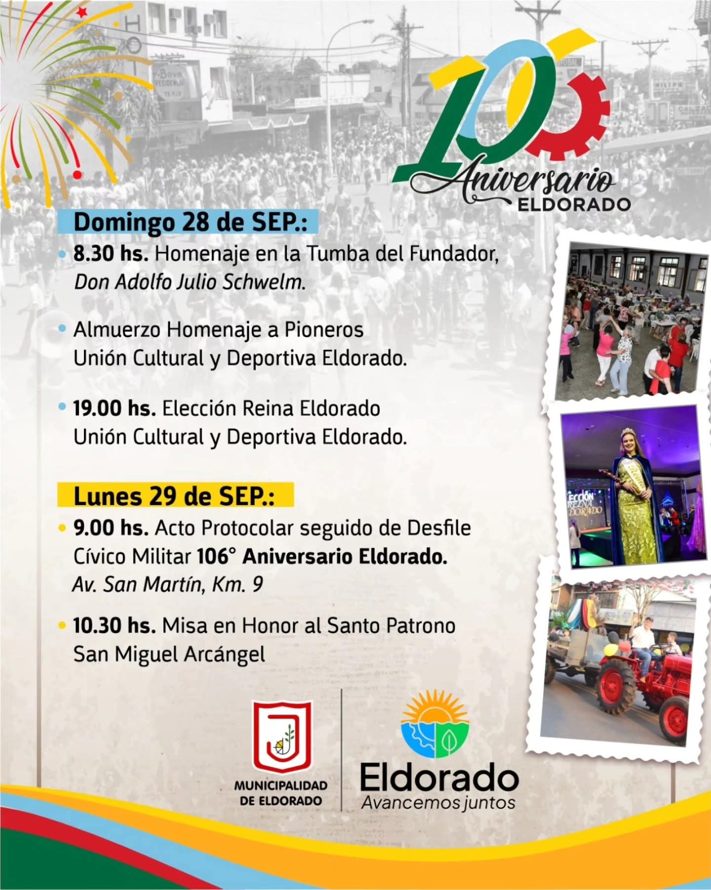 La ciudad de Eldorado ya comenzó a vivir su mes aniversario, en el que celebrará sus 106 años de historia con un variado cronograma cultural, religioso y comunitario.