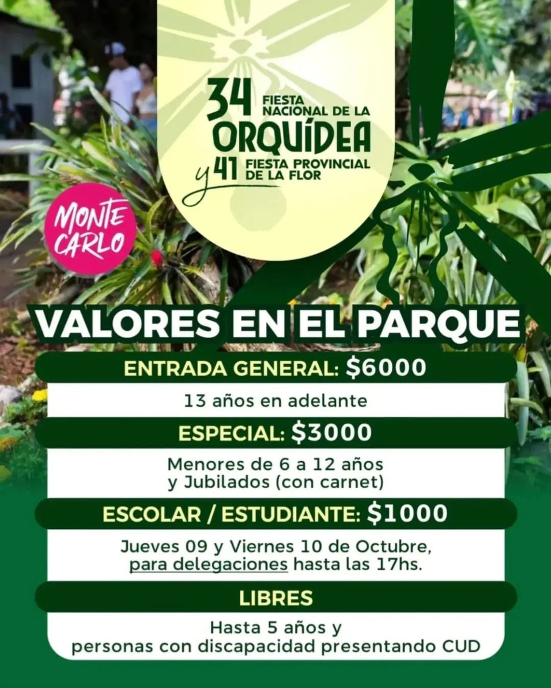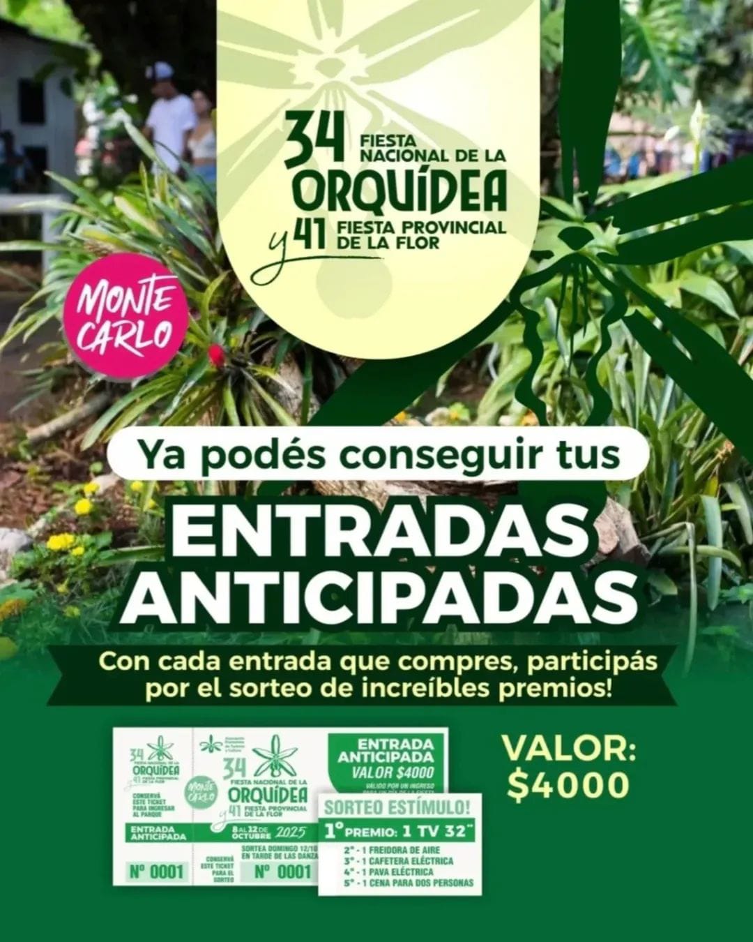 La Fiesta Nacional de la Orquídea y Provincial de la Flor 2025 ya tiene a la venta sus entradas anticipadas. Quienes adquieran su pase no solo aseguran su lugar en uno de los eventos más emblemáticos de Montecarlo, sino que además podrán participar de importantes sorteos que se realizarán durante la Tarde de las Danzas, el domingo 12 de octubre.