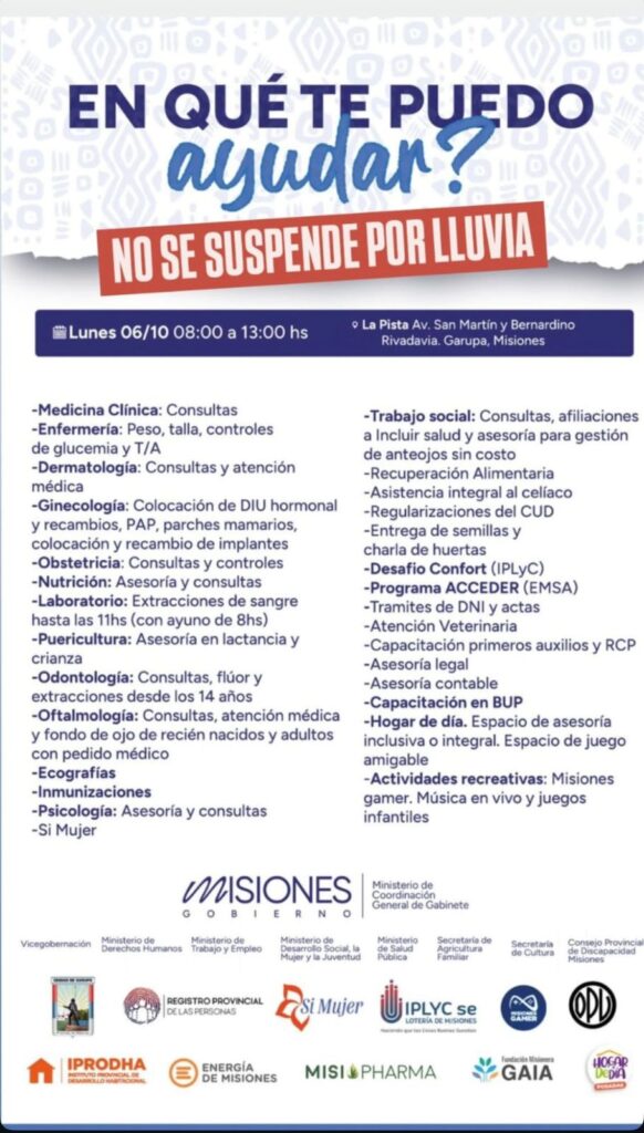 El operativo integral ¿En qué te puedo Ayudar? se realiza este lunes en Garupá desde las 8 hasta las 13 en barrio La Pista, en la intersección de la avenida San Martín y Bernardino Rivadavia. La iniciativa no se suspende por lluvias y busca reunir en un mismo espacio a organismos provinciales y municipales para brindar soluciones rápidas y sin costo a las familias.
