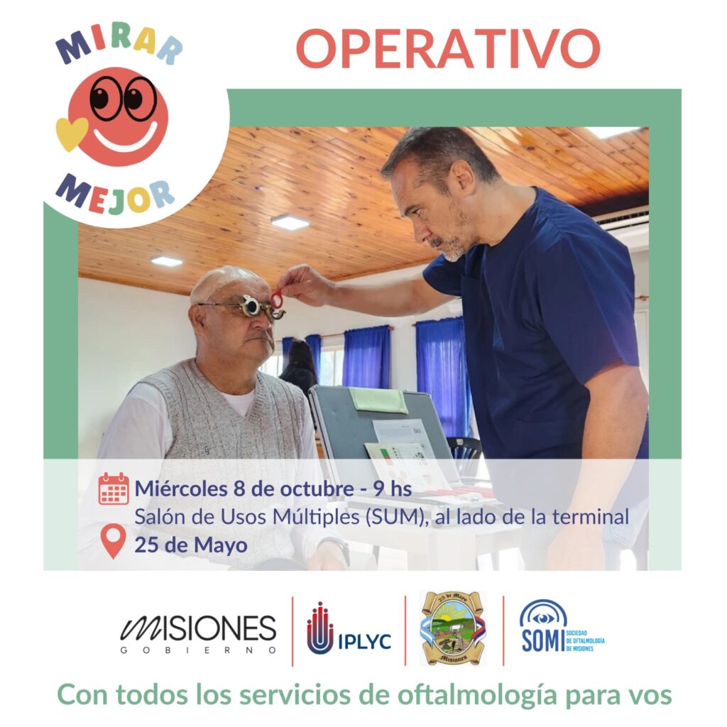 El programa Mirar Mejor alcanzará este miércoles 8 de octubre su operativo número 51 en 25 de Mayo. La jornada comenzará a las 9 horas, en el Salón de Usos Múltiples (SUM), ubicado al lado de la terminal, con servicios oftalmológicos sin costo para los vecinos.