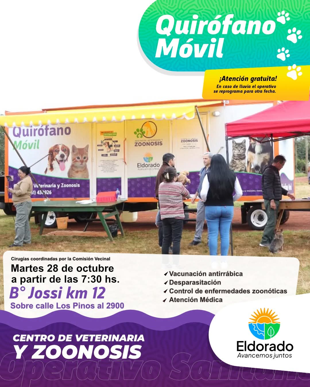 El martes 28 de octubre a partir de las 7:30 hs llega el Quirófano Móvil al barrio Jossi sobre la calle Los Pinos al 2900. Durante la jornada se realizará castraciones, vacunación antirrábica, desparasitación y control de enfermedades zoonóticas.
