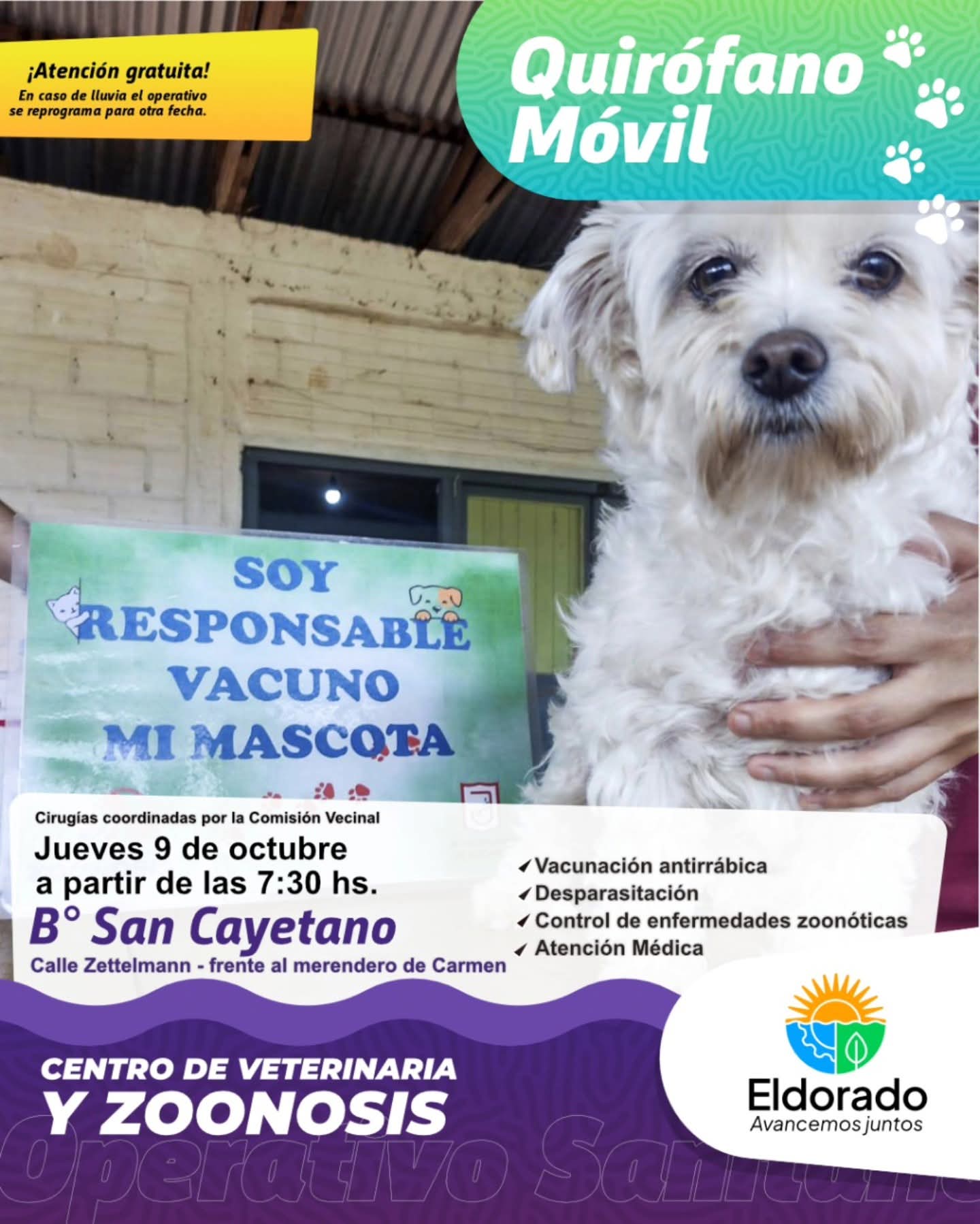 El jueves 9 de octubre a partir de las 7:30 hs llega el Quirófano Móvil al barrio San Cayetano sobre la calle Zettelmann (frente al merendero de Carmen). Durante la jornada se realizará castraciones, vacunación antirrábica, desparasitación y control de enfermedades zoonóticas.