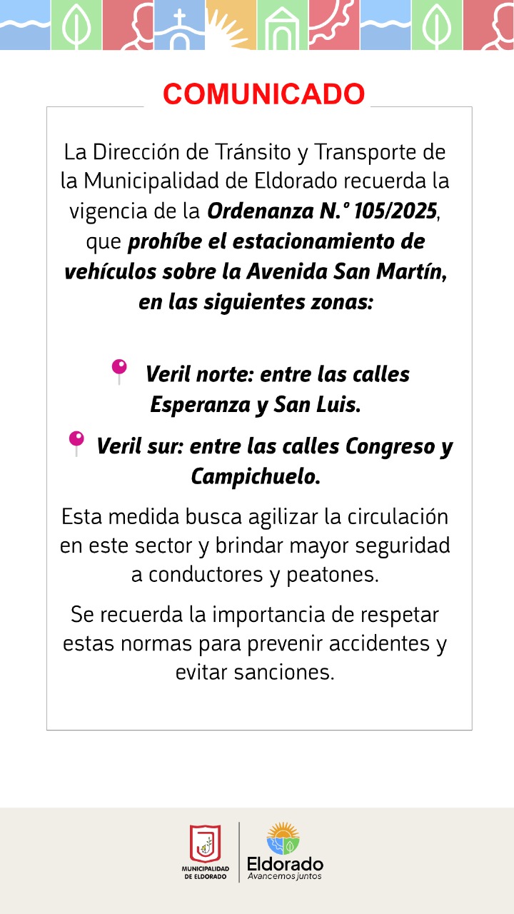 La Dirección de Tránsito y Transporte de la Municipalidad de Eldorado recordó que se encuentra vigente la Ordenanza N.º 105/2025, la cual prohíbe el estacionamiento de vehículos sobre la Avenida San Martín en las siguientes zonas: