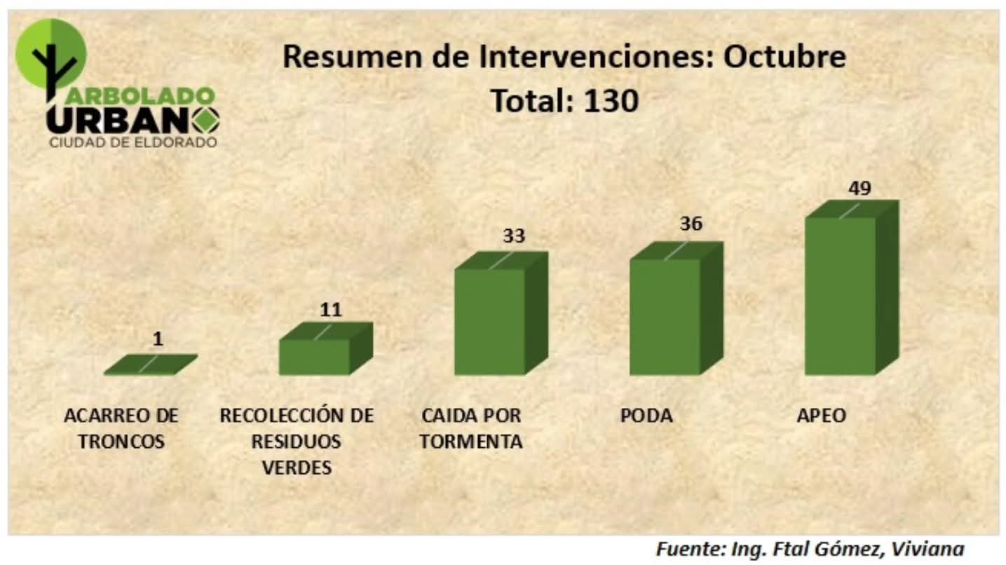 En el mes de octubre se realizaron un total de 130 intervenciones sobre el arbolado urbano de la ciudad de Eldorado, distribuidas en diversas acciones orientadas al mantenimiento, la seguridad y el manejo correcto de los ejemplares.