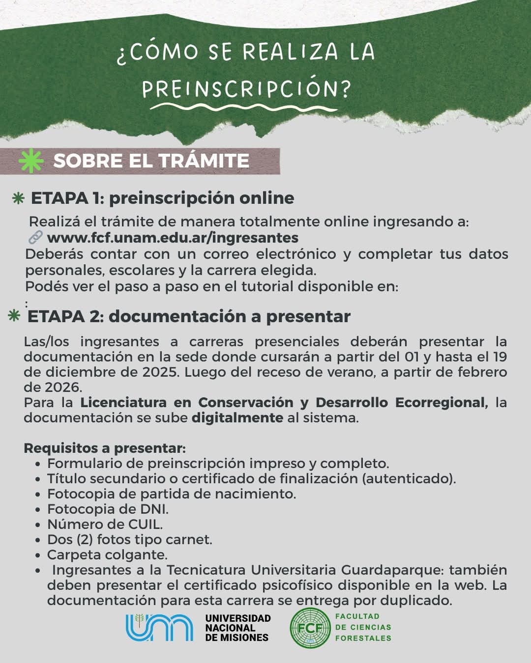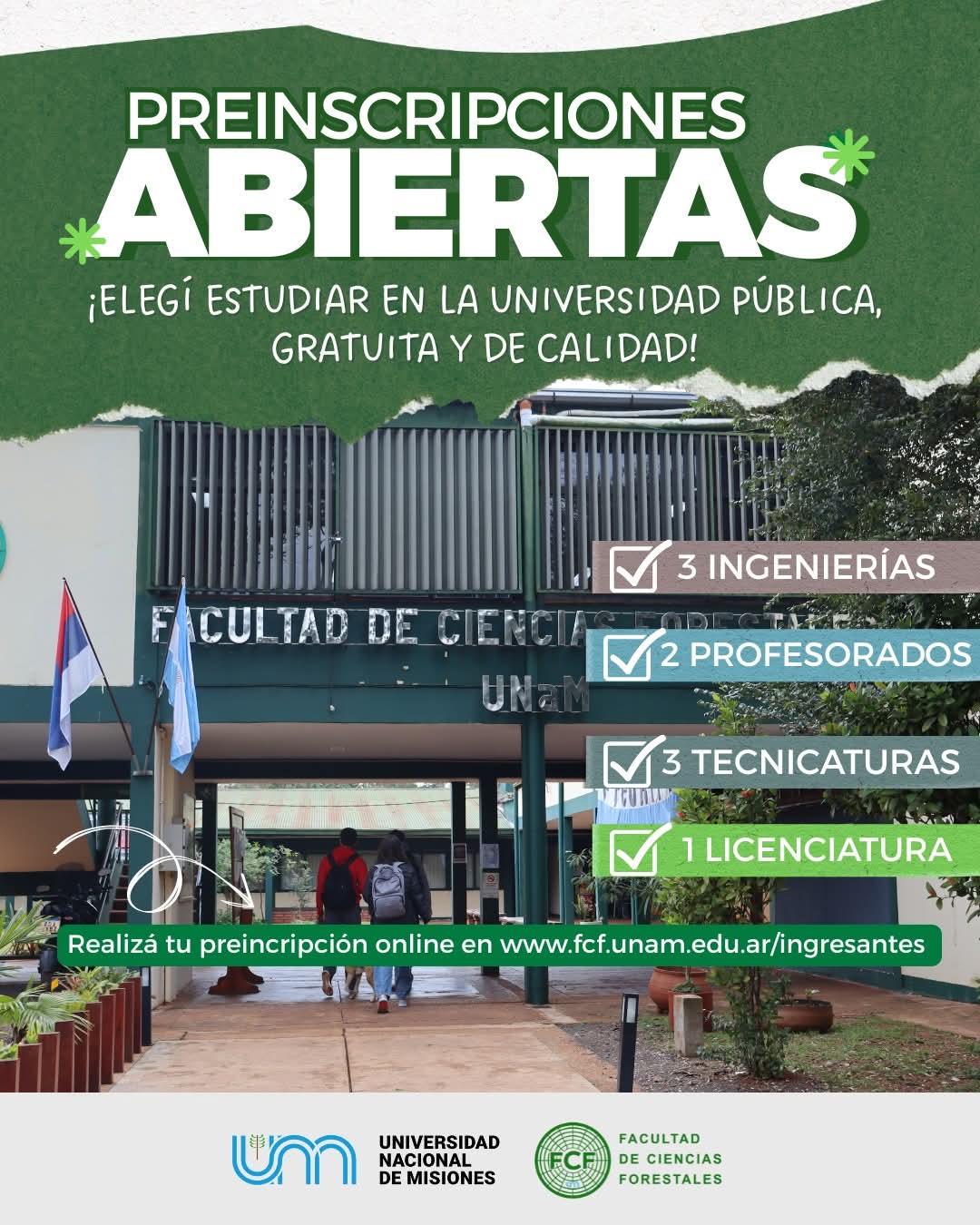 La Facultad de Ciencias Forestales informa que ya están abiertas las preinscripciones para el Ciclo 2026. Este procedimiento constituye la primera etapa del trámite de ingreso y se realiza de manera totalmente online a través del sitio institucional: www.fcf.unam.edu.ar/ingresantes.