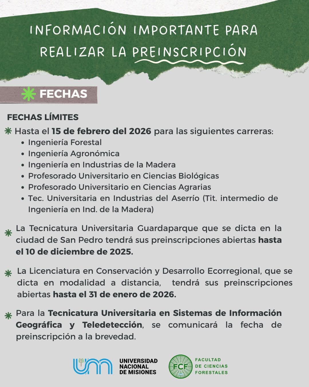 En el caso de la Tecnicatura Universitaria Guardaparque, que se dicta en la ciudad de San Pedro, el período de preinscripción se extenderá hasta el 10 de diciembre de 2025. Para la Licenciatura en Conservación y Desarrollo Ecorregional, de modalidad a distancia, el trámite estará disponible hasta el 31 de enero de 2026.