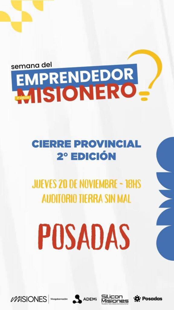 La Semana del Emprendedor Misionero cierra su este jueves su edición 2025 con una jornada en Posadas desde las 18 en el Auditorio Tierra Sin Mal, ubicado en el cuarto tramo de la Costanera. La actividad llega luego de cuatro días de propuestas en Oberá, Eldorado y espacios virtuales, con foco en el desarrollo del ecosistema emprendedor provincial.