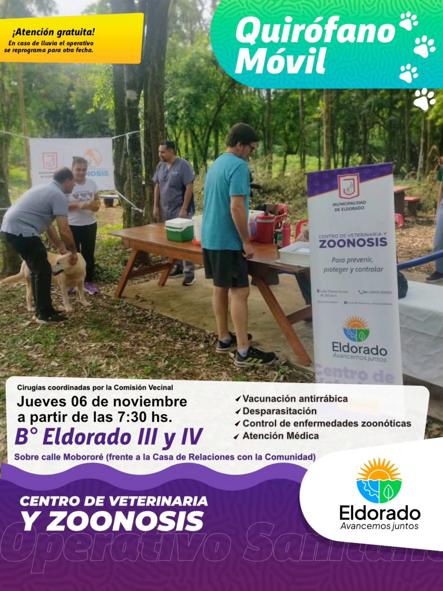 El Centro de Veterinaria y Zoonosis de Eldorado informó la reprogramación del operativo de esterilización de mascotas, que se llevará a cabo el jueves 6 de noviembre en los barrios Eldorado III y IV, a partir de las 7:30 hs.