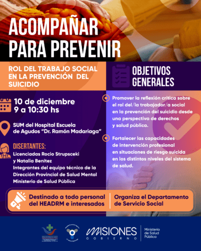 En el marco del Día del Trabajador Social, el Hospital Escuela de Agudos “Dr. Ramón Madariaga” llevará adelante una jornada sobre prevención del suicidio este miércoles 10 de diciembre, a las 9, en el SUM del hospital. El encuentro busca fortalecer la conciencia social sobre una problemática que afecta a toda la provincia, generando un espacio de aprendizaje, prevención y acompañamiento.