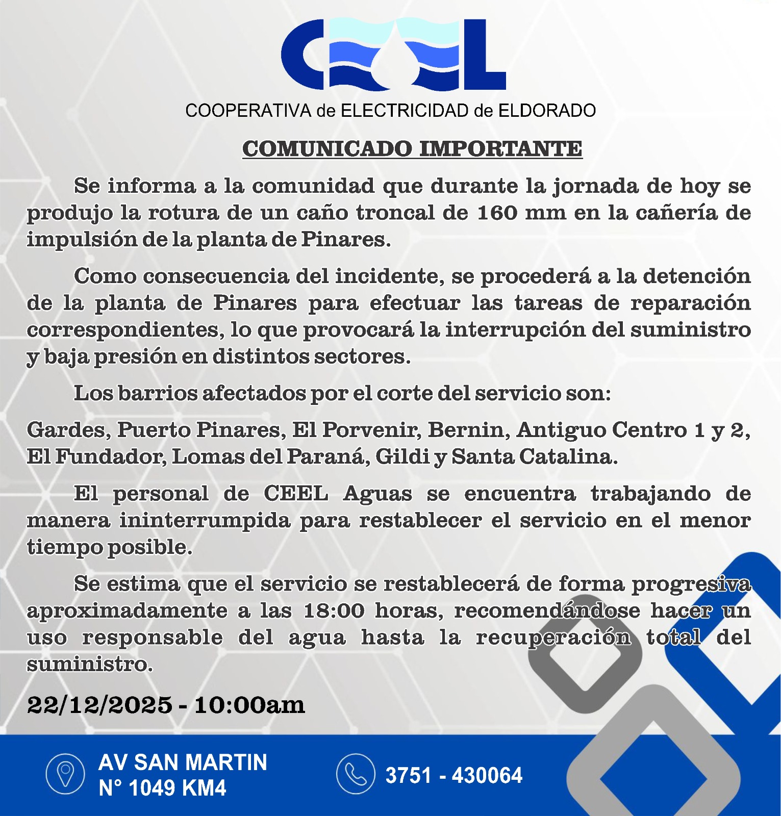 La Cooperativa de Electricidad de Eldorado (CEEL) informó a la comunidad que durante la jornada de hoy, 22 de diciembre de 2025, se produjo la rotura de un caño troncal de 160 mm en la cañería de impulsión de la planta de Pinares. Como consecuencia directa de este incidente, se ha procedido a la detención de la planta para que los equipos técnicos puedan efectuar las tareas de reparación correspondientes, lo que ha derivado en la interrupción del suministro de agua potable y baja presión en distintos puntos de la ciudad.