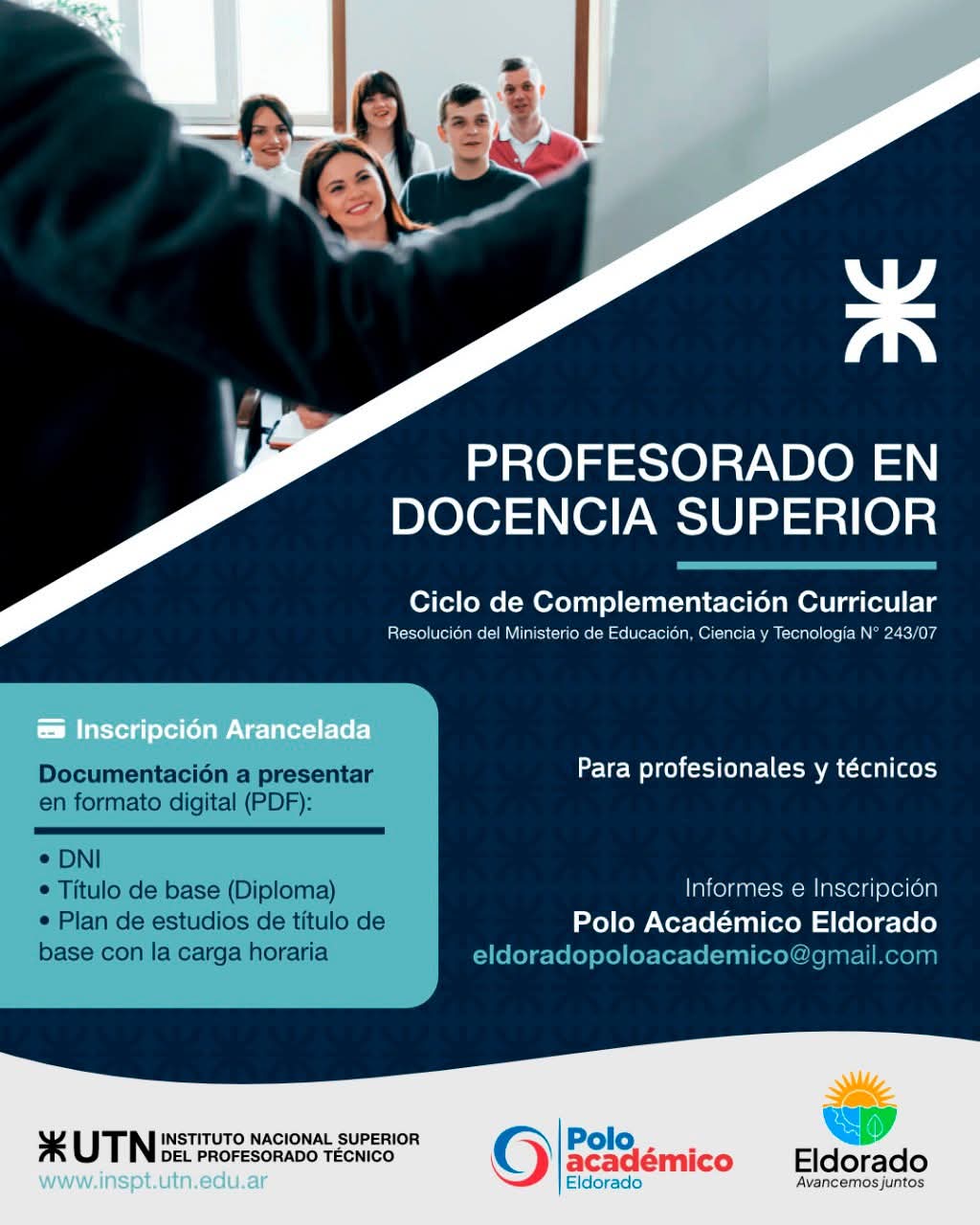El Polo Académico Eldorado informó que ya se encuentra abierta la Preinscripción para la nueva cohorte 2026 del Profesorado en Docencia Superior, correspondiente al Ciclo de Complementación Curricular destinado a quienes deseen obtener el título de Profesor/a en Docencia Superior.