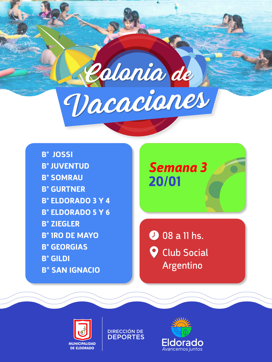 La Municipalidad de Eldorado, a través de la Dirección de Deportes, informó que comienza la tercera semana de la Colonia de Vacaciones Municipal 2026, una propuesta recreativa destinada a niños y niñas de distintos barrios de la ciudad.
