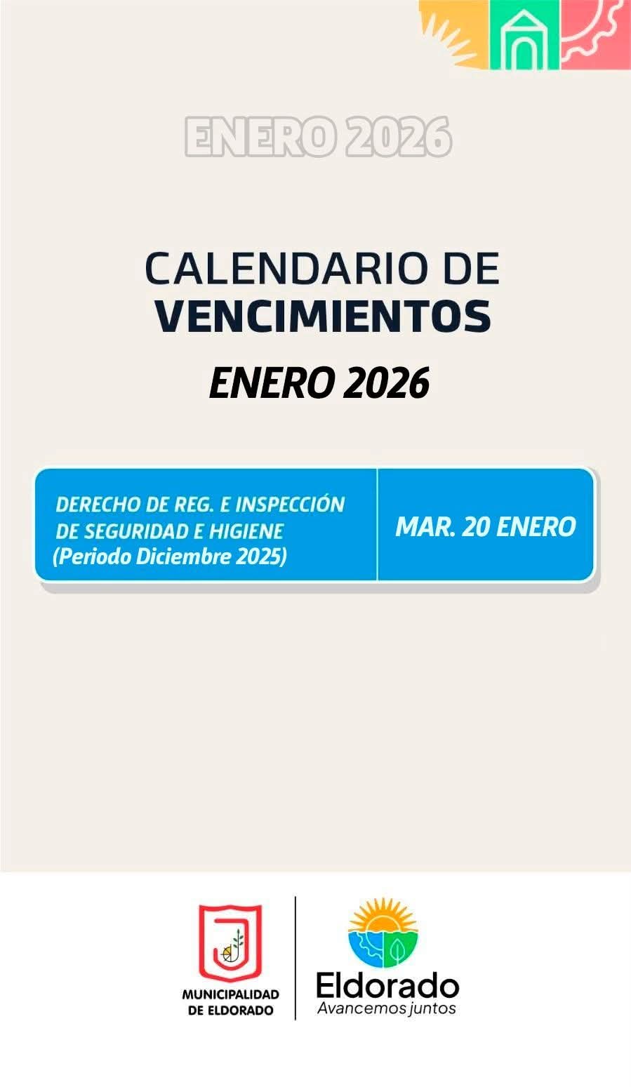 La Municipalidad de Eldorado recordó a los contribuyentes las fechas clave correspondientes al calendario de vencimientos de obligaciones municipales del mes en curso.