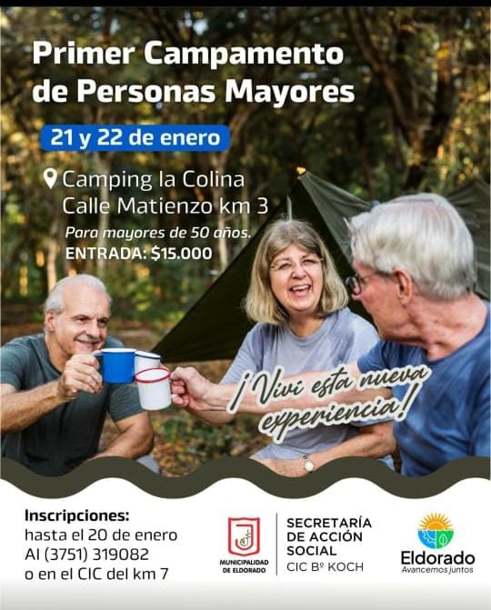 La Municipalidad de Eldorado invita a todas las personas mayores de 50 años de los distintos barrios de la ciudad a participar del Primer Campamento para Personas Mayores, una propuesta pensada para promover la recreación, la convivencia y el disfrute al aire libre.