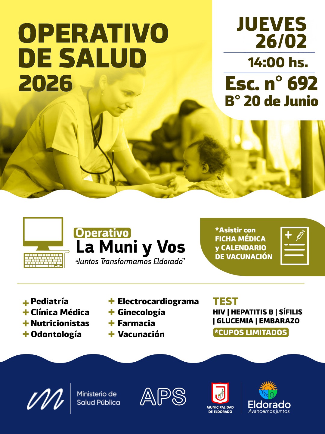Este jueves 26 de febrero, a partir de las 14:00 hs, se llevará adelante un nuevo Operativo de Salud 2026 en la Escuela N° 692 del barrio 20 de Junio, en el marco del programa “Operativo La Muni y Vos”, impulsado por la Municipalidad de Eldorado junto al Ministerio de Salud Pública y APS.