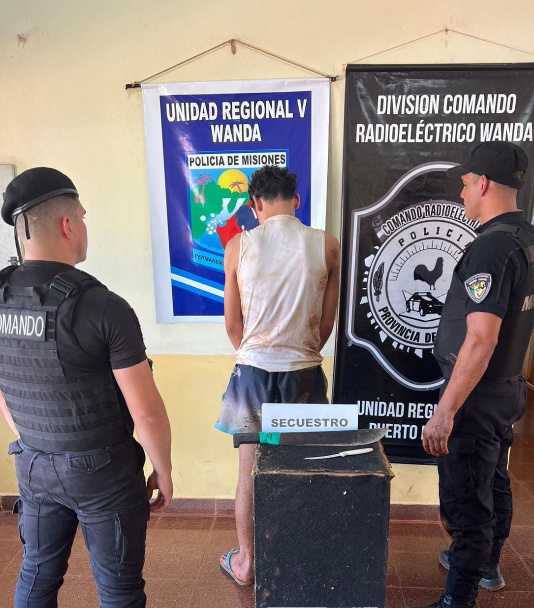 El primer hecho se registró el lunes a las 18:00 hs en el barrio Nueva Argentina de Wanda, donde Leandro D. (23) alias “Gordo”, fue detenido luego de que su hermana denunciara que había amenazado de muerte a su familia con un machete. Al llegar la Policía, el sujeto intentó agredir al personal con un arma blanca y huyó hacia un descampado, pero fue alcanzado tras una persecución a pie. En el procedimiento se secuestraron (01) machete y (01) cuchillo.