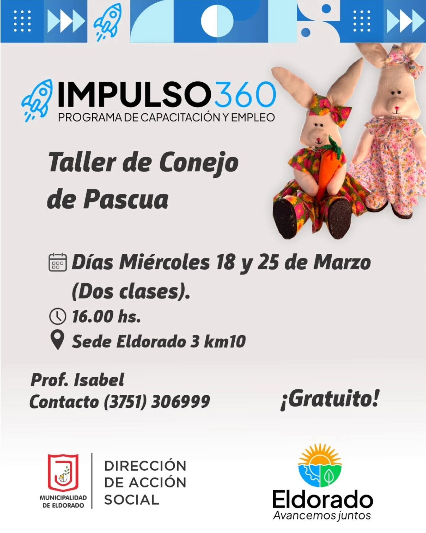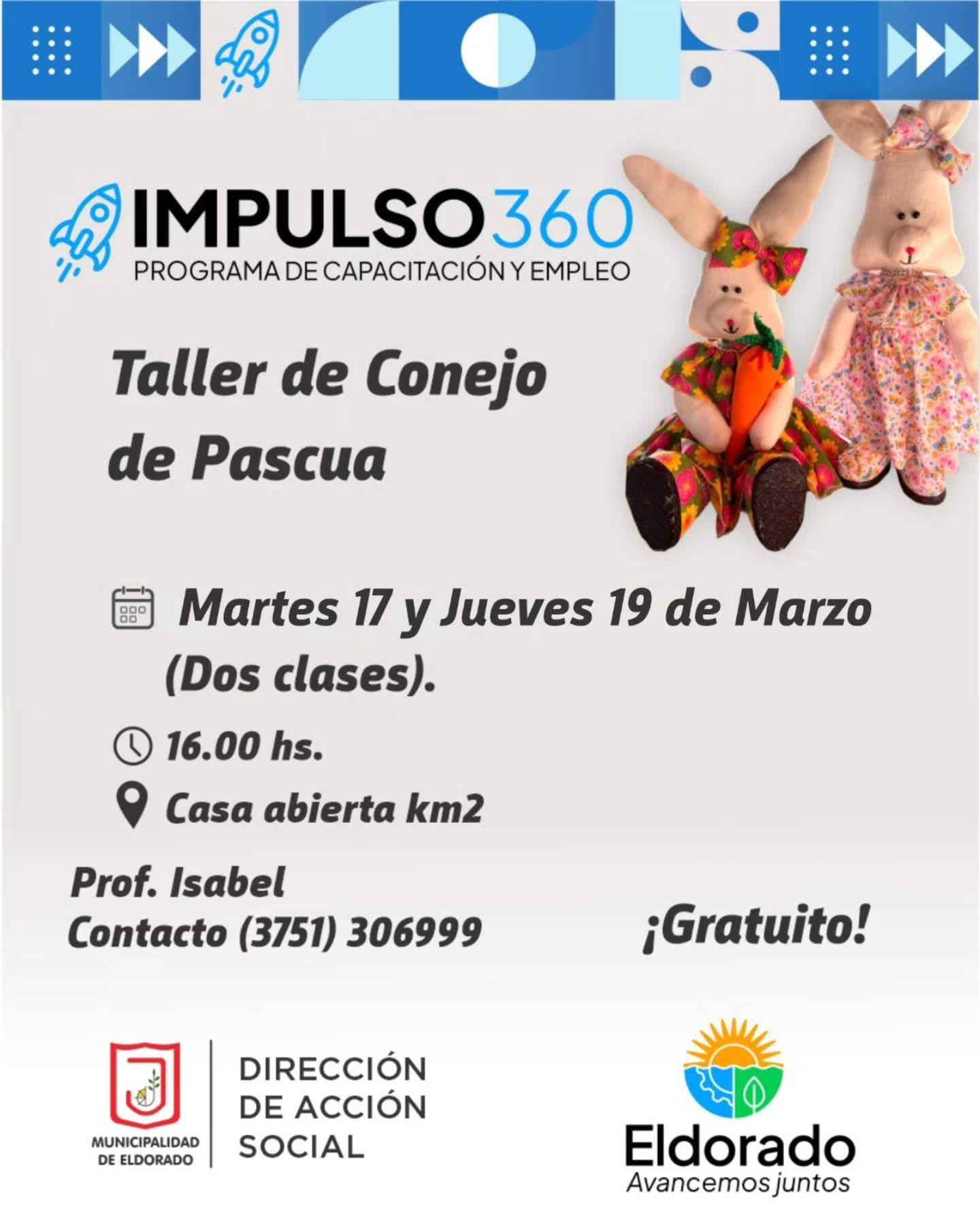 En el marco de las propuestas de capacitación del programa Impulso 360, se realizará un nuevo taller gratuito de confección de Conejo de Pascua en tela, una actividad pensada para que los participantes aprendan a crear sus propias piezas de manera artesanal.