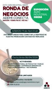 La Agencia para el Desarrollo Económico de Misiones impulsará una ronda de negocios para productores de yerba mate el sábado 11 de abril a partir de las 8, en el marco de la Exposición Agro Industrial de Oberá. La actividad, denominada Ademi Conecta, estará orientada a fortalecer la comercialización del sector y vincular a los productores con empresas y canales de venta del retail.