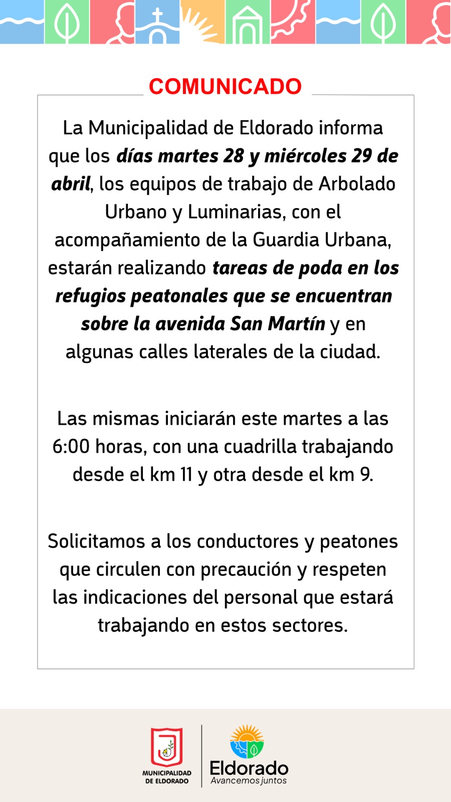 La Municipalidad de Eldorado informa que los días martes 28 y miércoles 29 de abril, los equipos de trabajo de Arbolado Urbano y Luminarias, con el acompañamiento de la Guardia Urbana, estarán realizando tareas de poda en los refugios peatonales que se encuentran sobre la avenida San Martín y en algunas calles laterales de la ciudad.