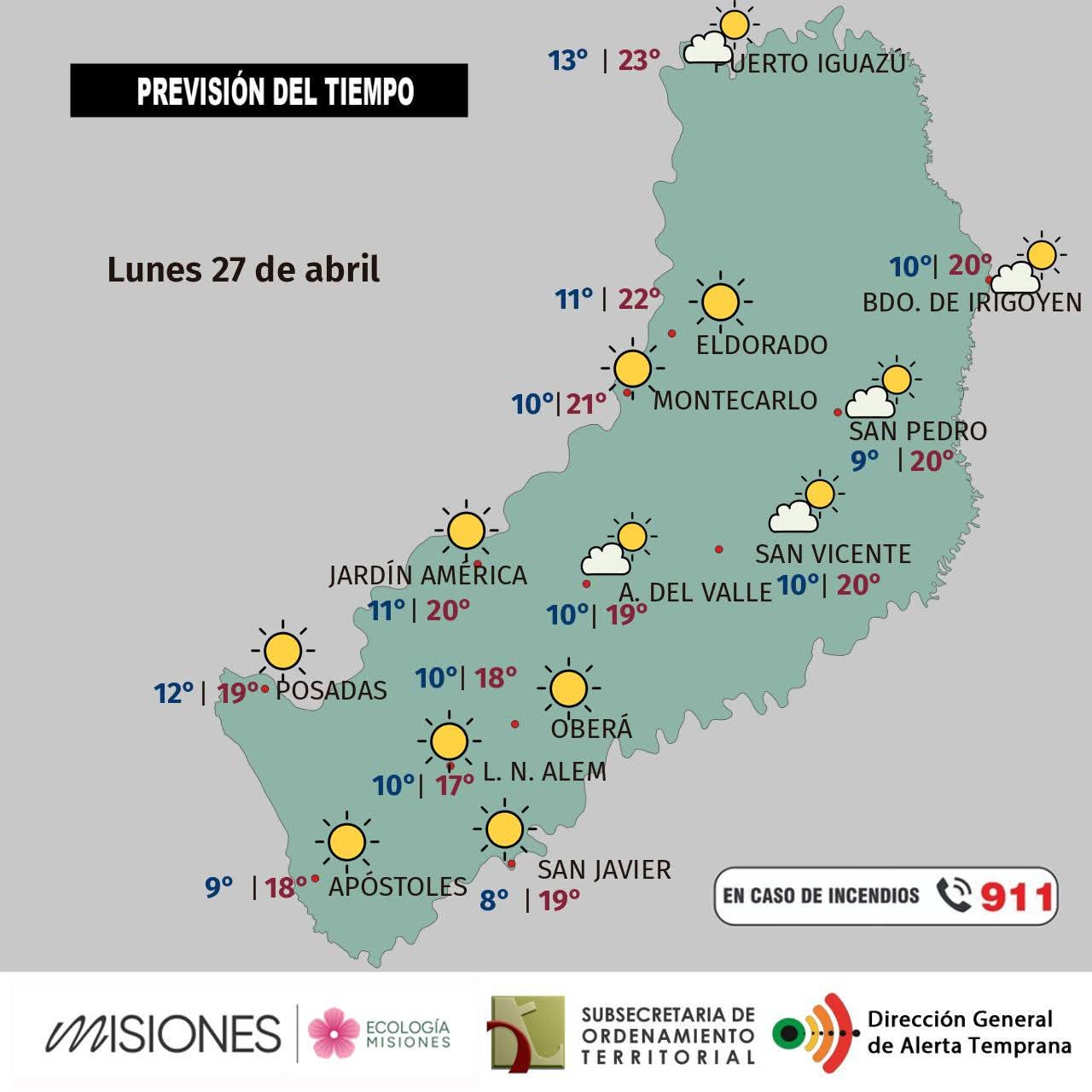 Temperaturas: máxima en la provincia estimada en 22 °C para Eldorado y la mínima sería de 8 °C en San Vicente.