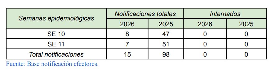 En las últimas dos semanas analizadas, correspondientes a mediados de marzo, se notificaron 15 casos sospechosos, una cifra muy inferior a la del mismo período de 2025, cuando se habían reportado 98 notificaciones. Además, no se registraron internaciones ni fallecimientos asociados a la enfermedad.