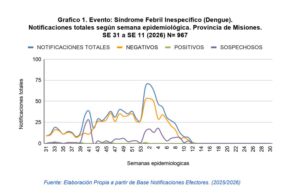 La provincia de Misiones cerró el verano 2026 sin casos autóctonos de dengue, según el último reporte del Ministerio de Salud Pública de Misiones. El informe, elaborado por la Dirección de Epidemiología, abarca el período comprendido entre la semana epidemiológica 31 de 2025 y la semana 11 de 2026.