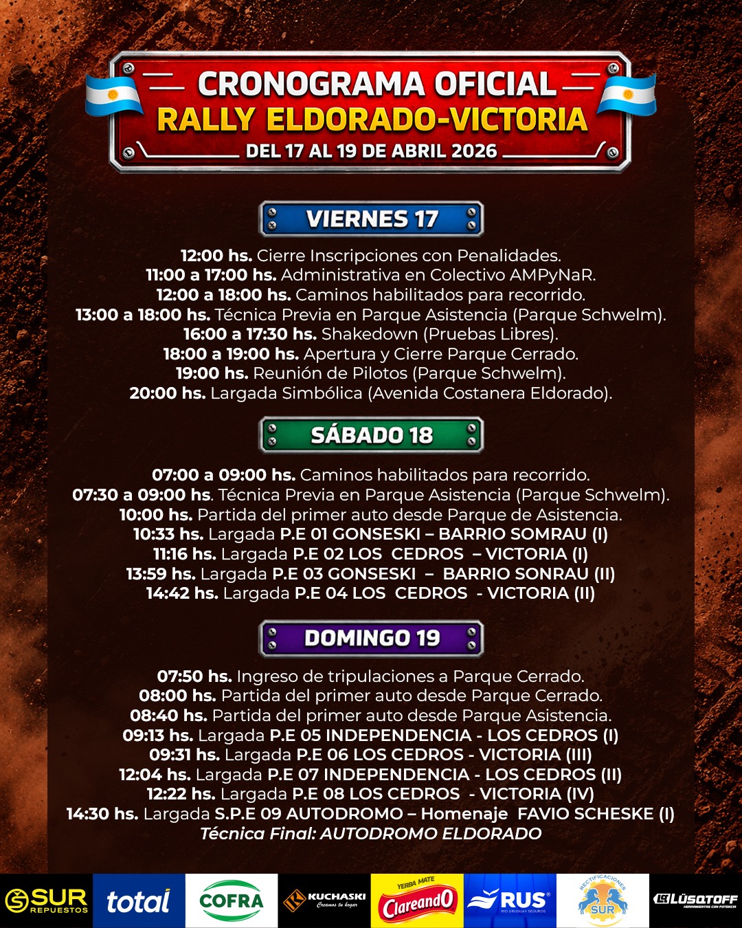 El sábado desde las 10.30 se pondrá en marcha la primera etapa que tendrá 4 pruebas especiales entre Eldorado y Colonia Victoria. Mientras que el domingo desde las 9 se disputará la segunda etapa. En el segundo día se cambiará un tramo de los caminos y se sumará el Súper Especial que se disputará en el Autódromo Ciudad de Eldorado y que será homenaje al fallecido mecánico Favio Scheske.