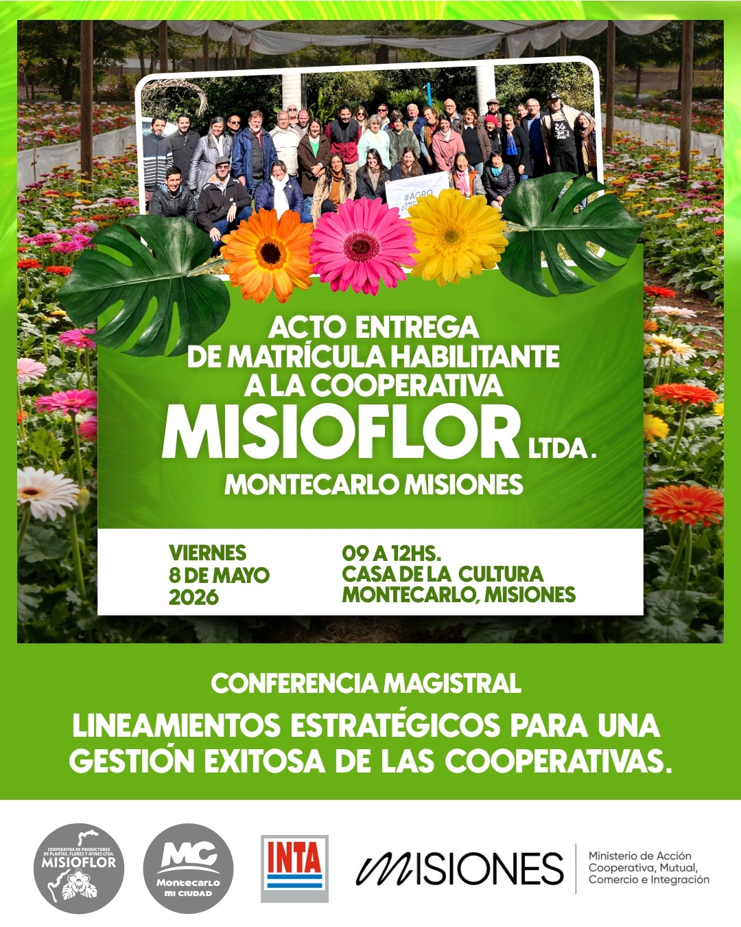 Montecarlo continúa consolidando su desarrollo productivo con una nueva iniciativa orientada al fortalecimiento del trabajo colectivo. El próximo viernes 8 de mayo, de 9 a 12 hs, en la Casa de la Cultura, se llevará a cabo la entrega de la matrícula habilitante a la Cooperativa “MISIOFLOR” Ltda., integrada por productores locales de plantas y flores.