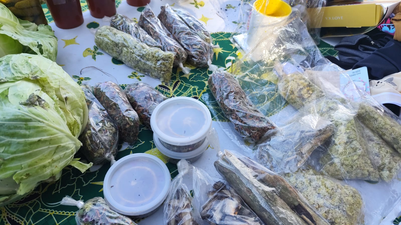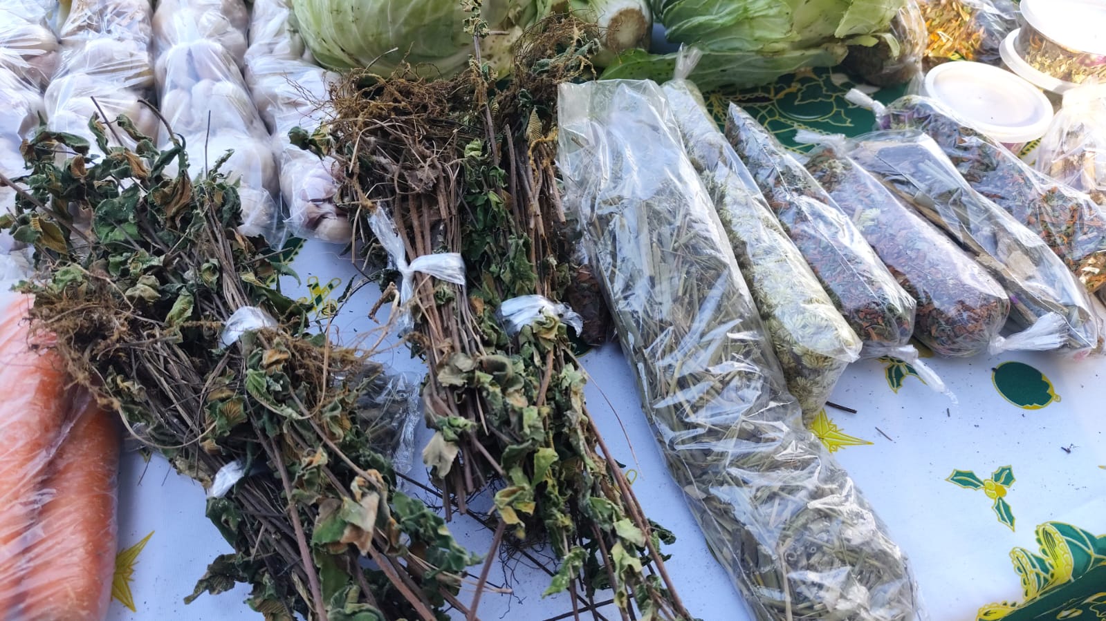 Durante la feria, sorprendió con una amplia oferta de hierbas medicinales y productos naturales: marcela, moringa, eneldo, anís, burrito y cola de caballo, entre otros. Muchas de estas plantas se utilizan en infusiones o para el mate, conservando saberes tradicionales transmitidos de generación en generación.